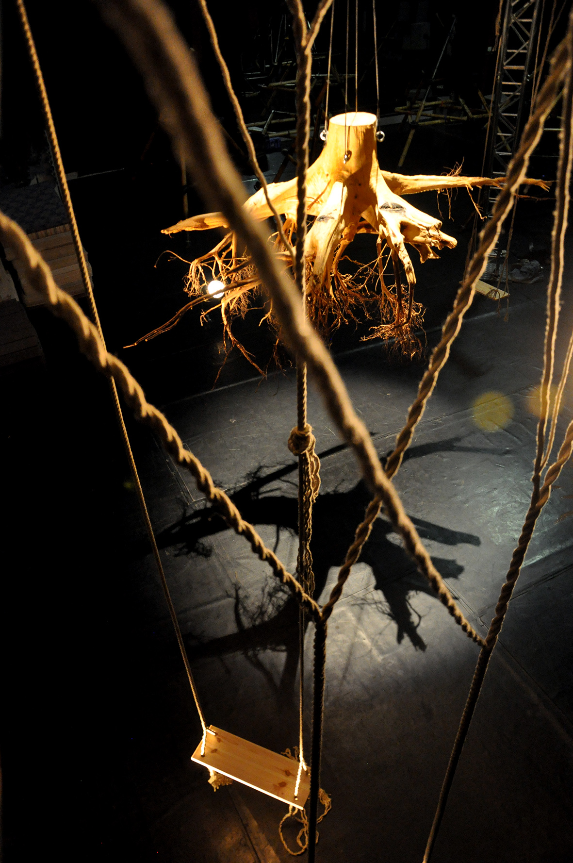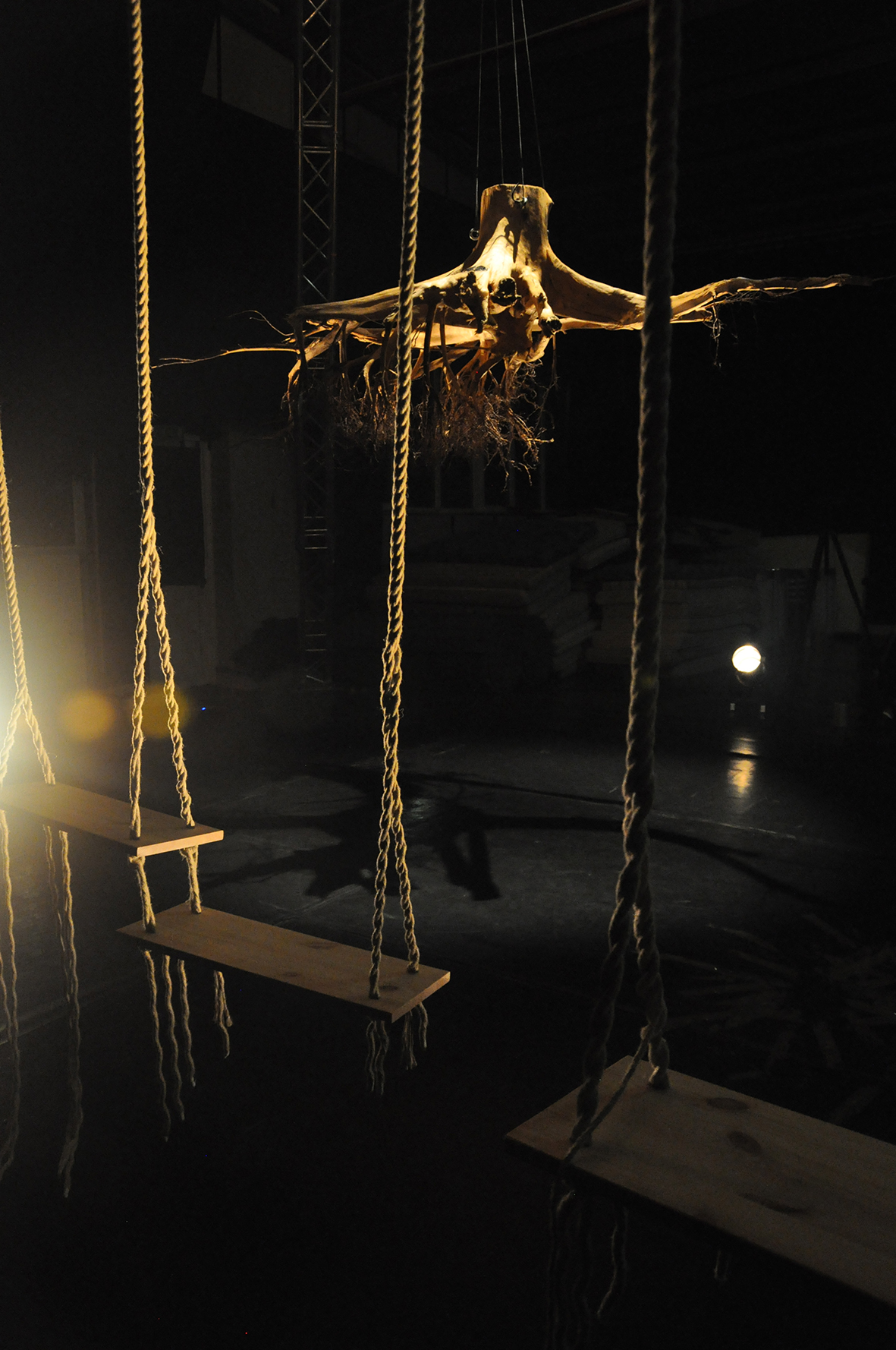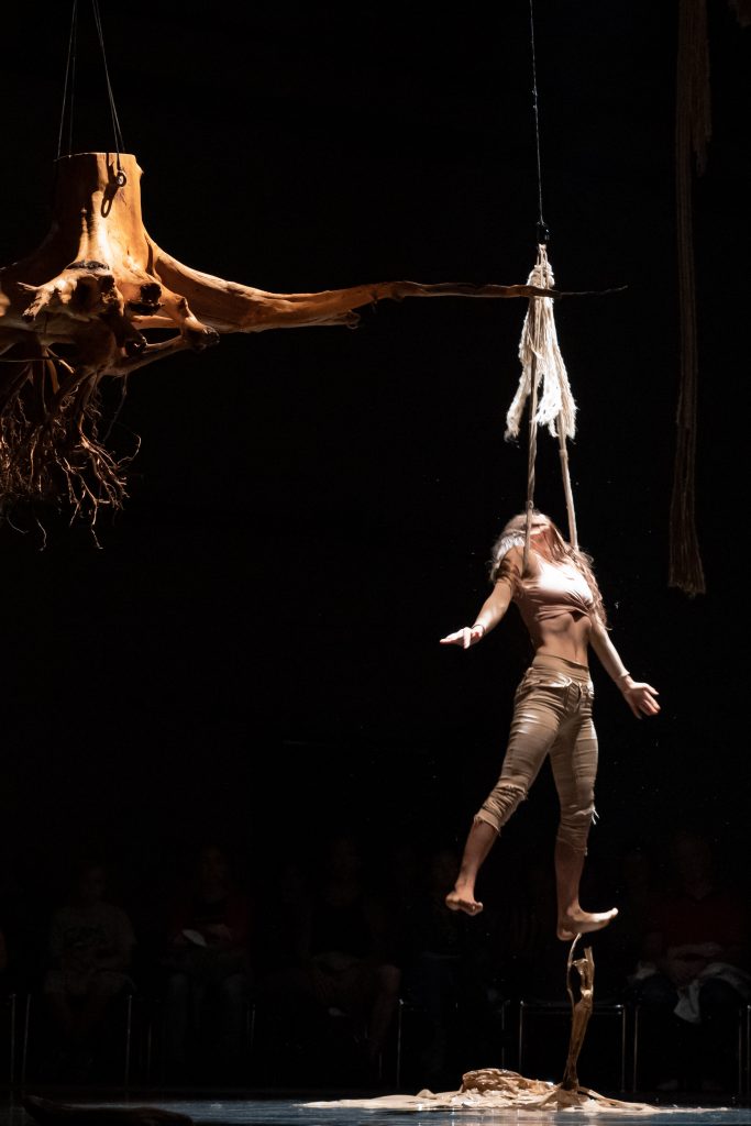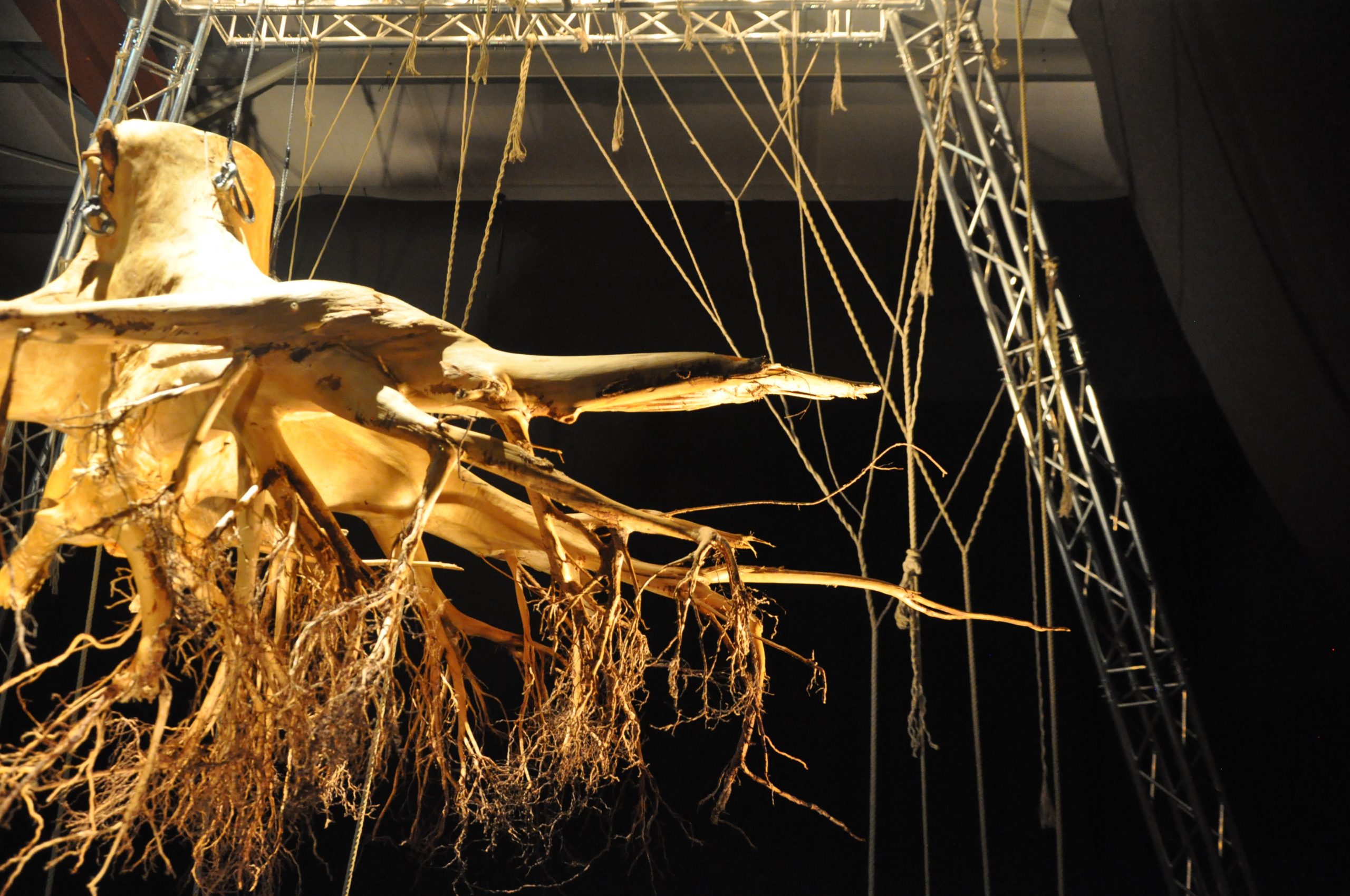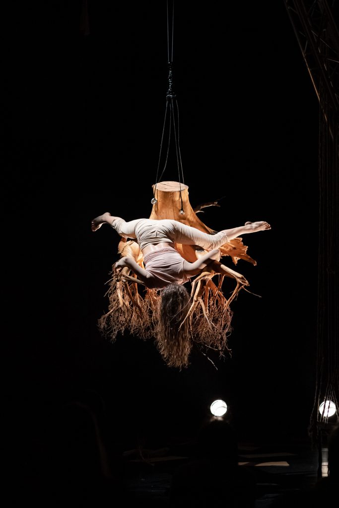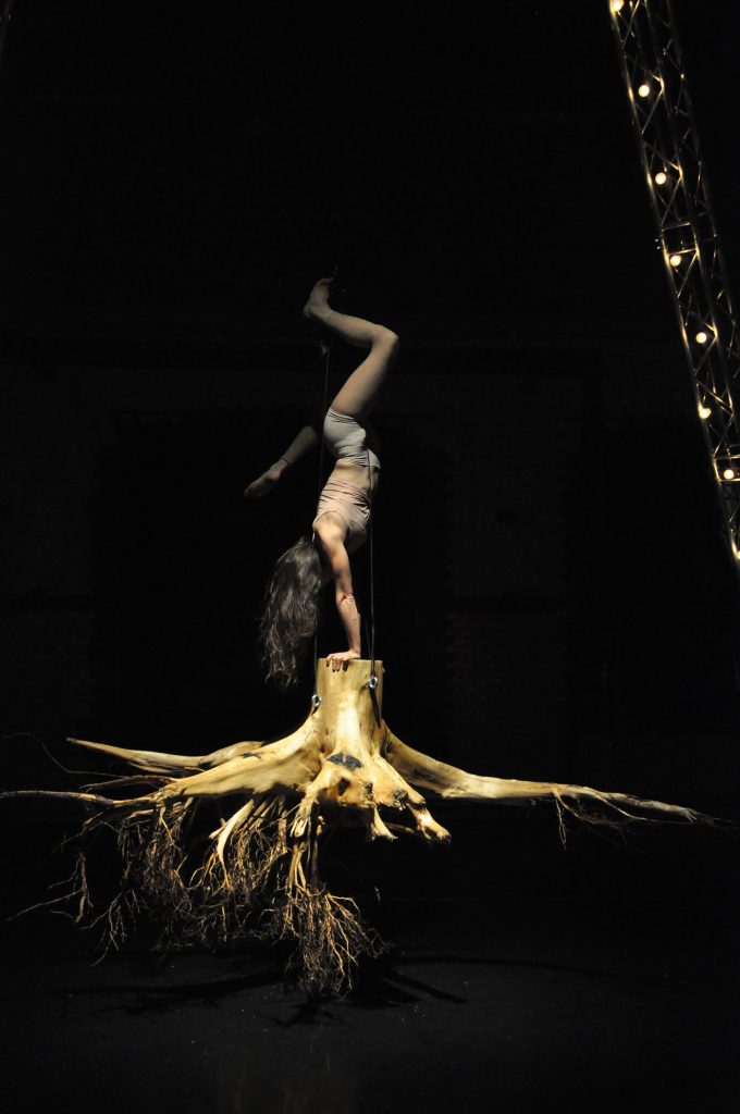 STRIKING ROOTS INTO THE VOID is an interdisciplinary performance piece, merging circus, dance, live music, performance and installation art – featuring beyond-tricks aerial acrobatic movement on a suspended natural pine tree root.