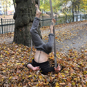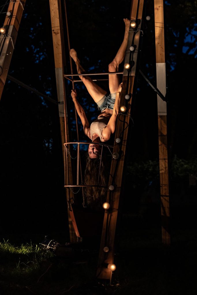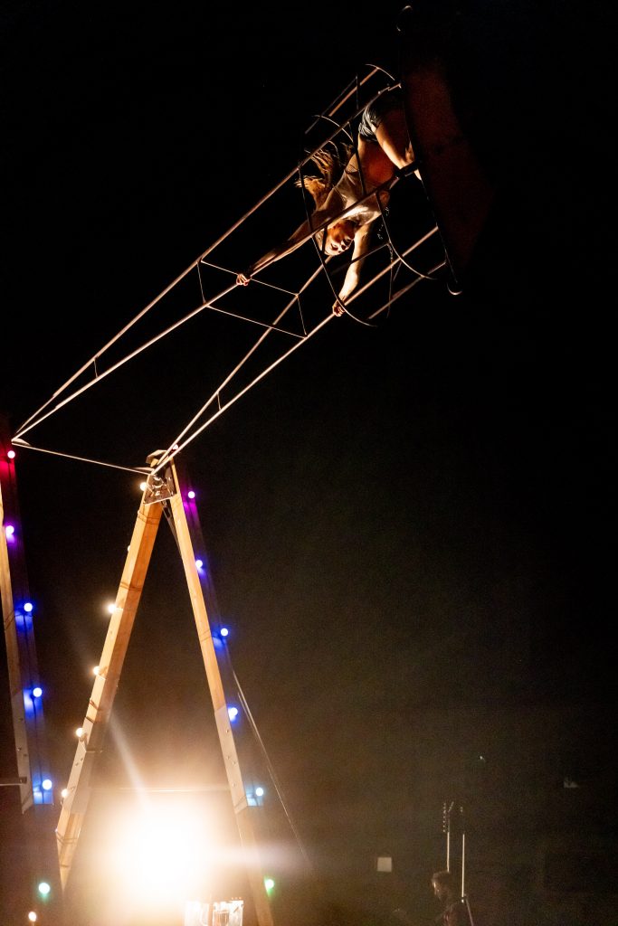 Exploring radical physical transformations in the setting of a swing-boat fun fair ride, the performance inspires associations to the boat of the ferry Charon crossing the river to the underworld.