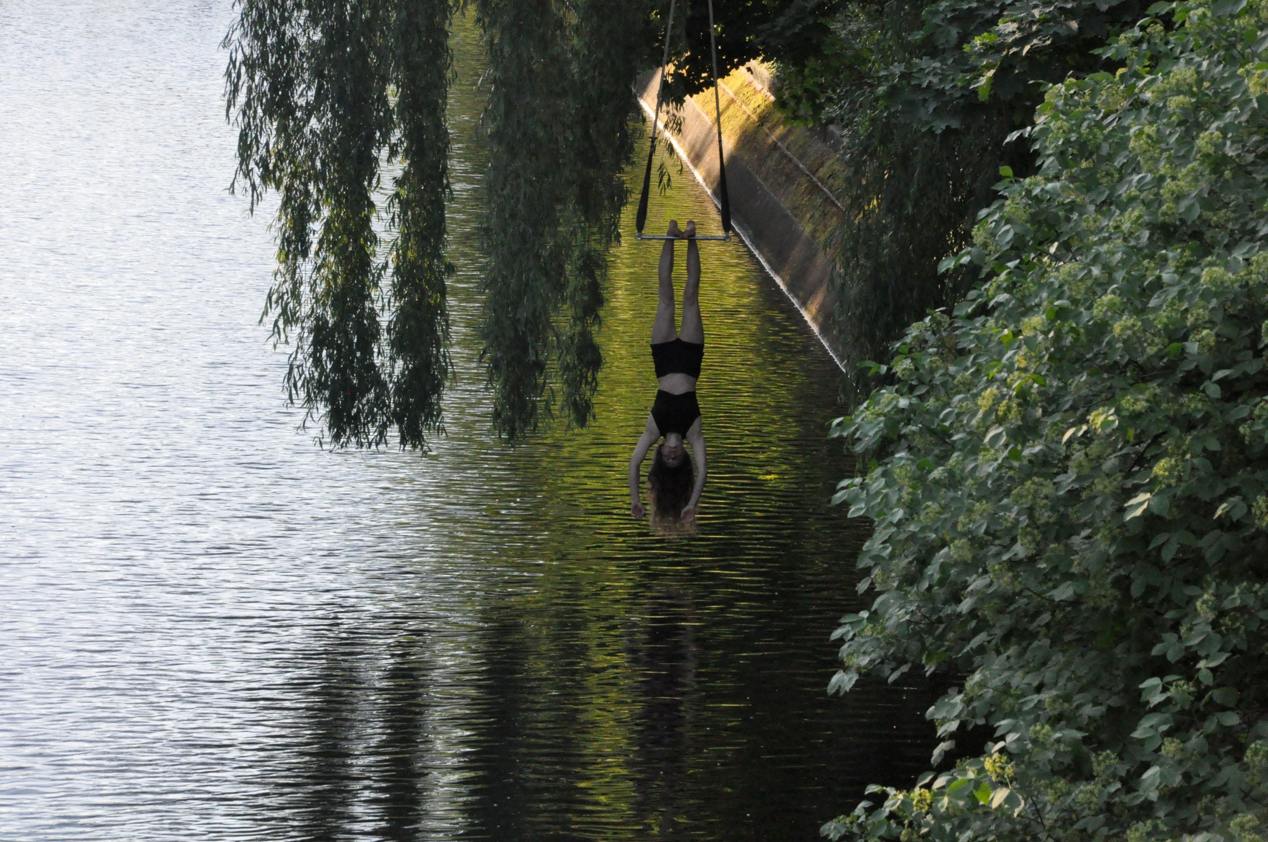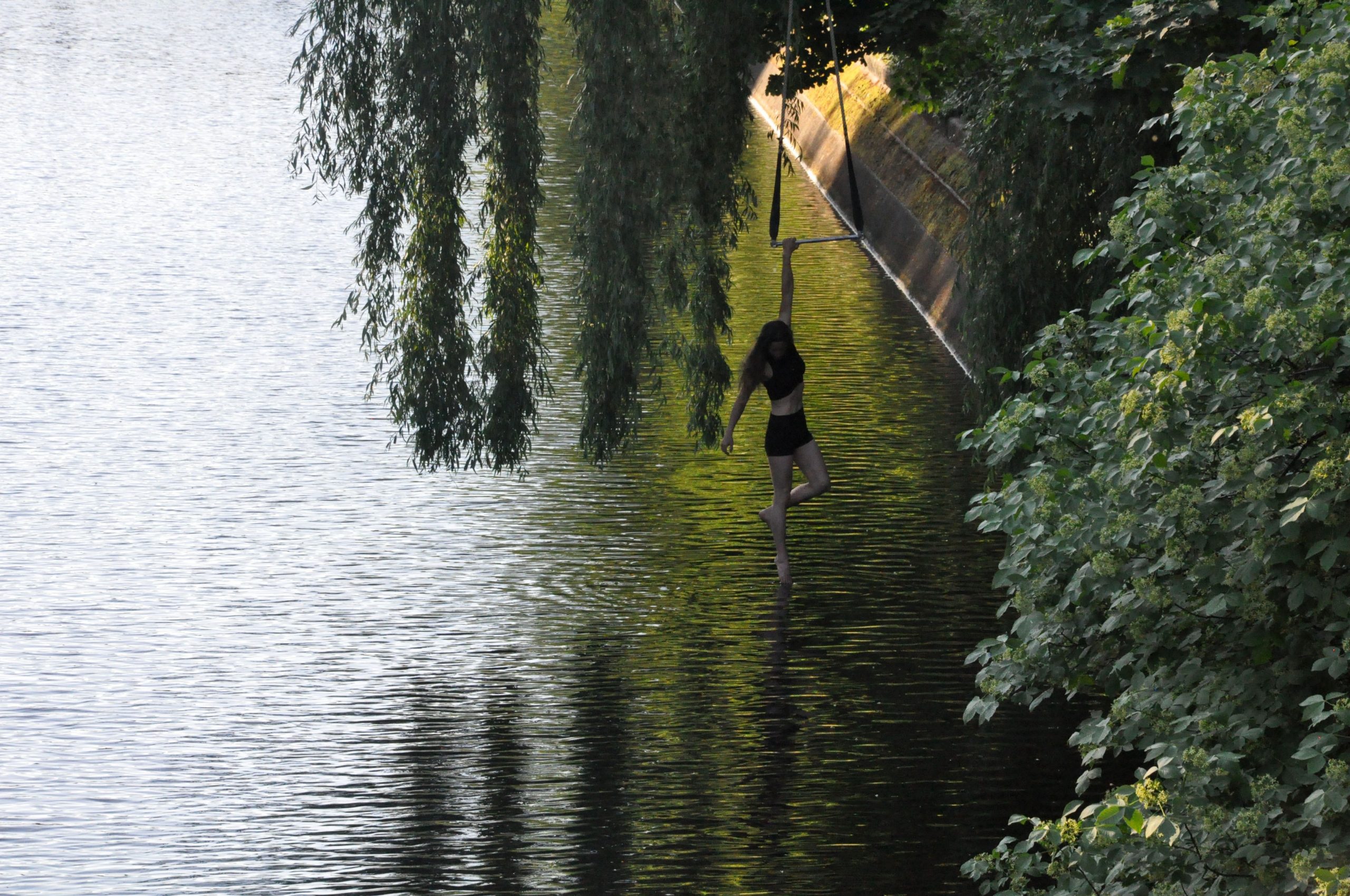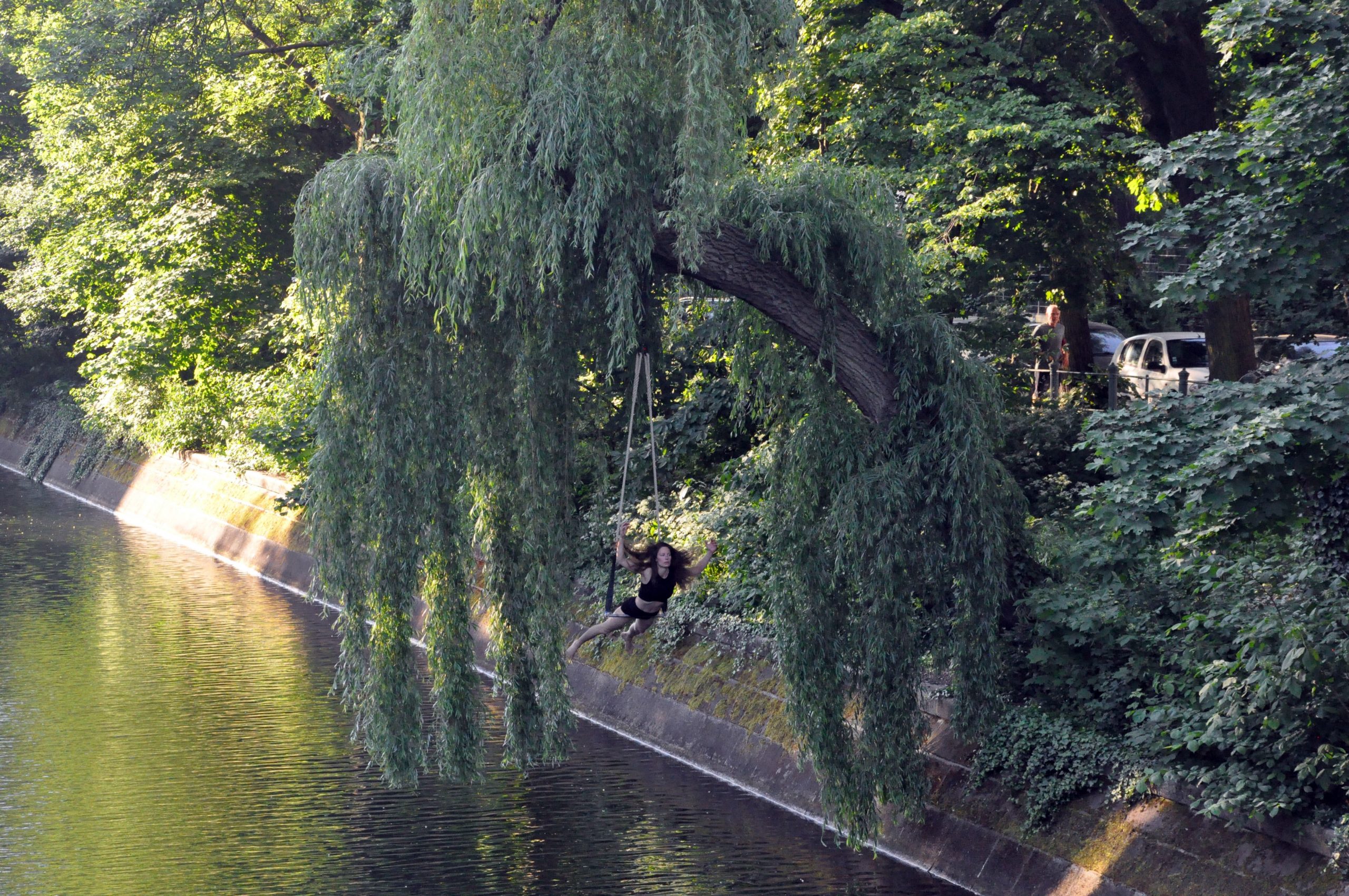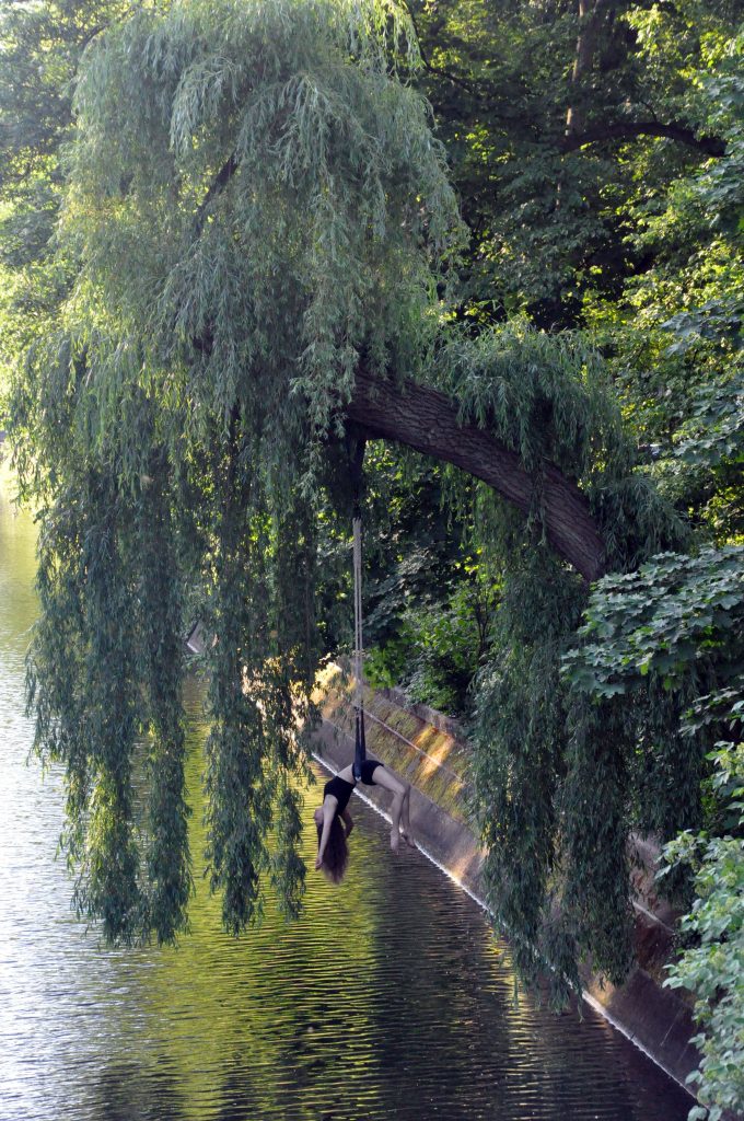 one afternoon over the canal in Berlin I had this beautiful moment with a willow tree leaning over the waters. Actually this experience has been a key moment for my current research around the deconstruction of trapeze art. This extraordinary meeting gave me a great insight about the very basic nature of trapeze (you know these so simple thoughts that you feel weird calling it a big discovery because it is so basic, but actually it changes your entire perspective) – that the object of a bar on ropes does not make it a trapeze yet – it needs the connection to a higher structure to become one.